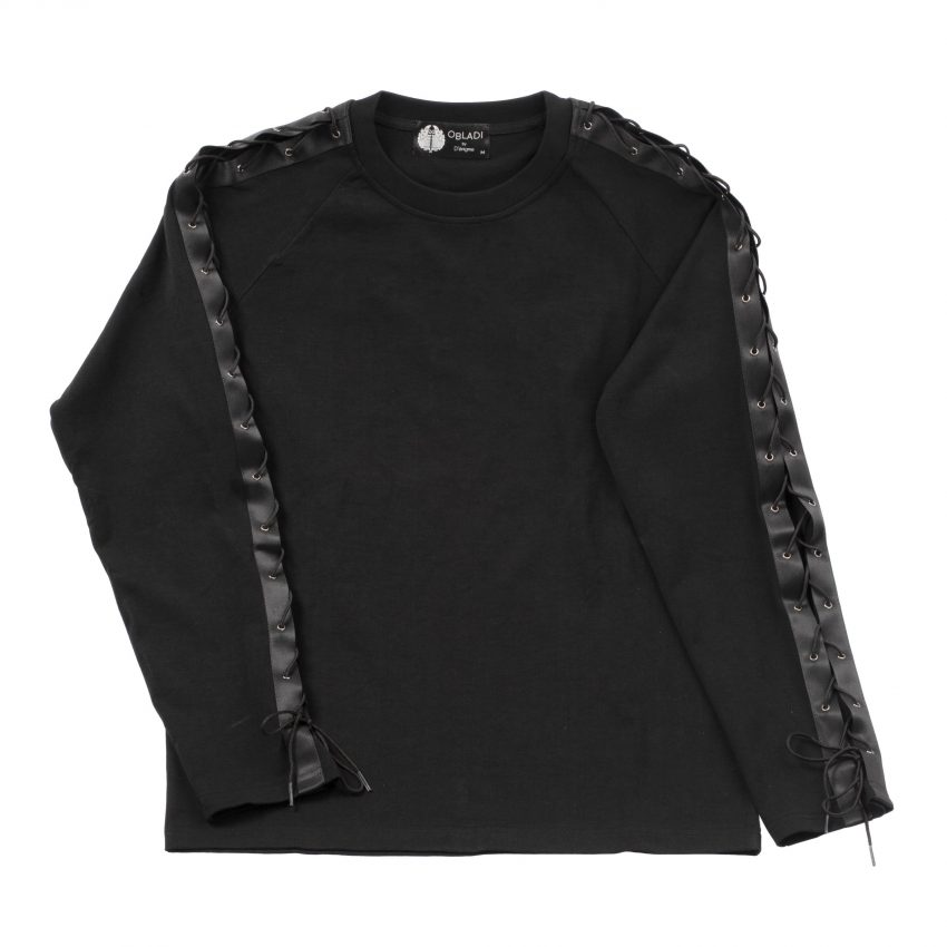 Tapes and laces are sewn from the neck to shoulder and finish and the trim of the sleeve.