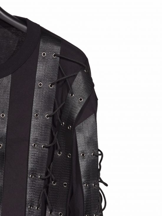 The body is 100% cotton for comfort. The tapes are 100% Polyester with a bit of shining effect.